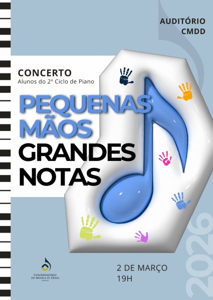 No dia 2 de março às 19h00 no auditório do CMDD, teremos o Concerto "Pequenas mãos, grandes notas" dedicado aos alunos do 2º Ciclo das Classes de Piano.