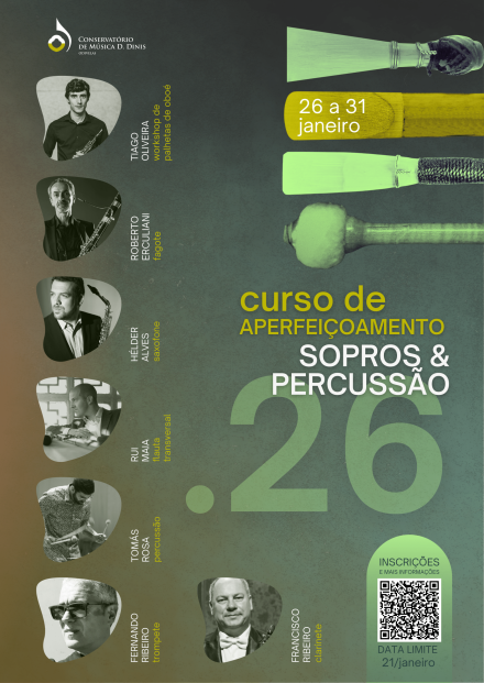 Flauta, Oboé, Clarinete, Fagote, Saxofone, Trompete, Trompa e Trombone são os intrumentos de sopro lecionados no Conservatório