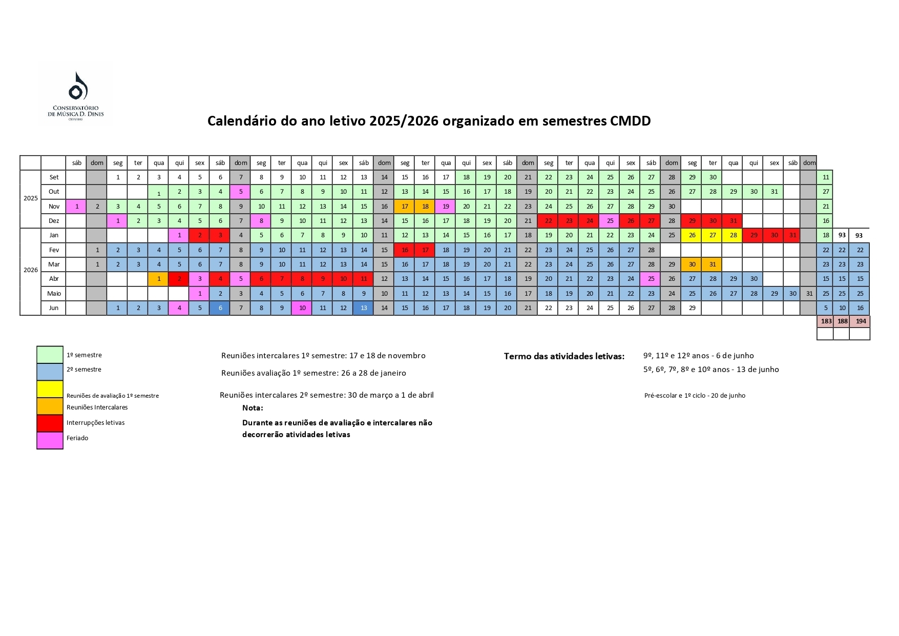 De acordo com o Despacho nº 8356/2022, o calendário escolar previsto para 2025-26 organizado em semestres e tendo em conta as diretivas aprovadas pelos Agrupamentos do Concelho de Odivelas, o conservatório aprovou o seu calendário para os Cursos de Música, que poderá consultar no anexo disponível neste site.